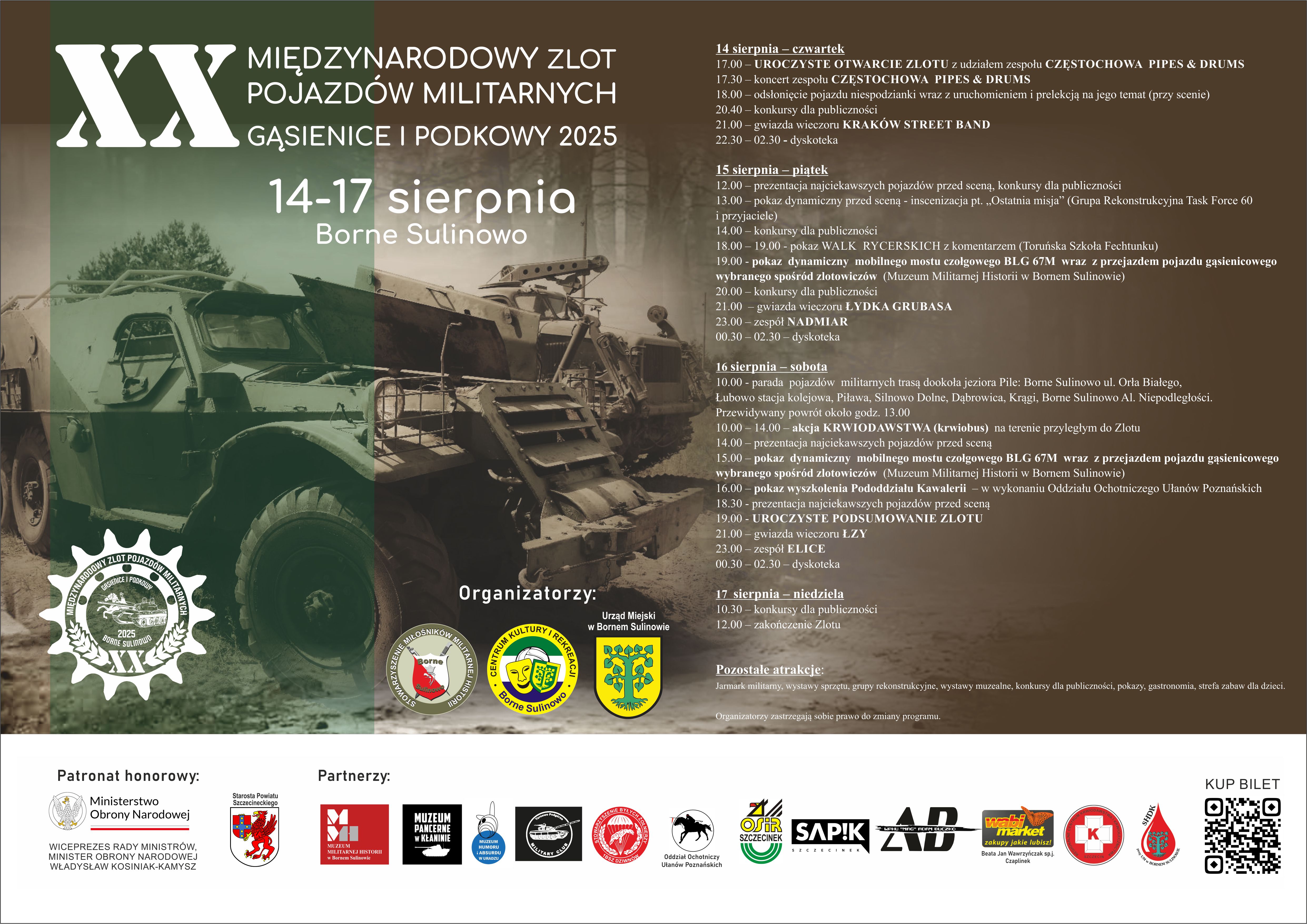 W dniach 14-17 sierpnia 2025 roku Borne Sulinowo ponownie zamieni się w stolicę militariów i historii. Czekają na Was widowiskowe pokazy pojazdów wojskowych, rekonstrukcje historyczne, przejażdżki pancernymi kolosami, strefa handlowa, strefa gastronomiczna, mnóstwo atrakcji dla całych rodzin – w tym specjalna strefa dla dzieci, a także ... koncerty!????????