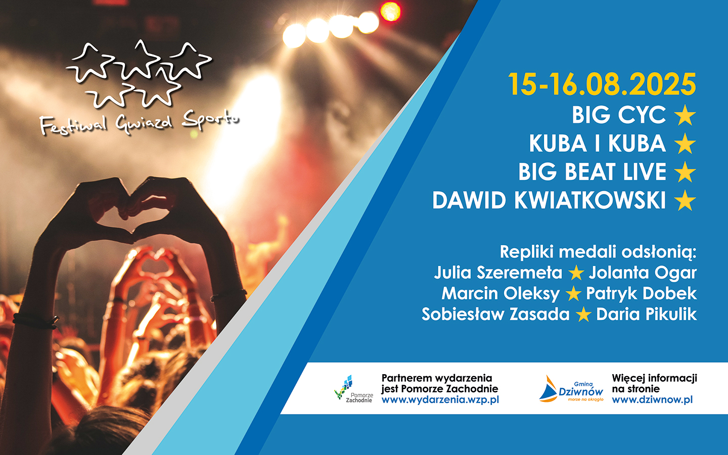 Na muzycznej scenie XXIII Festiwalu Gwiazd Sportu w Dziwnowie będziemy mogli zobaczyć i usłyszeć zespół BIG CYC, na którego koncert zapraszamy w piątek 15 sierpnia 2025 roku. Następnego dnia, tj. w sobotę 16 sierpnia 2025 roku, wystąpi przez Państwem DAWID KWIATKOWSKI. Wśród muzycznych wykonawców nie zabraknie także zespołu KUBIA i KUBA oraz BIG BEAT LIVE.