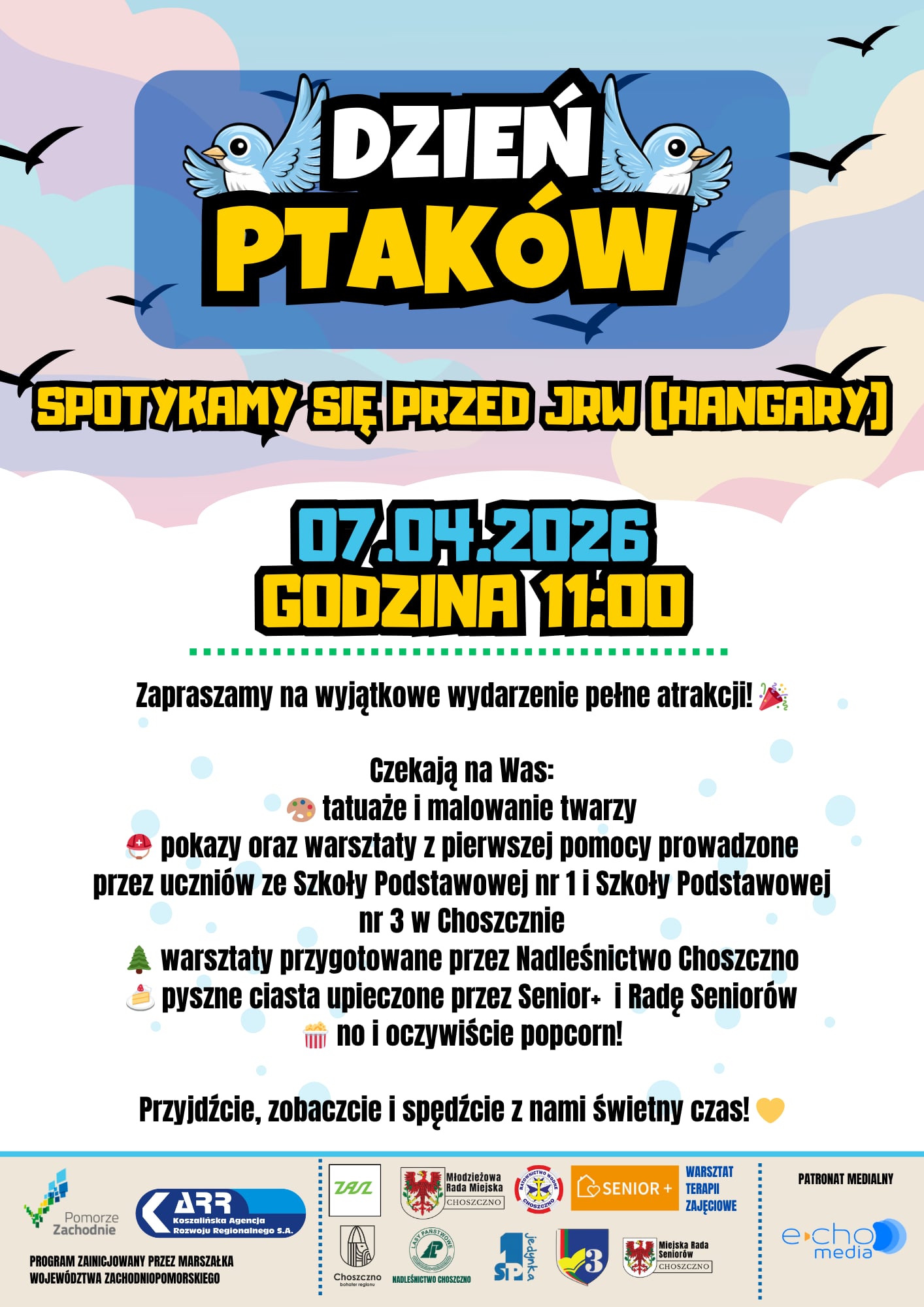 Młodzieżowa Rada Miejska w Choszcznie wraz z partnerami: Jednostką Ratownictwa Wodnego, Warsztatem Terapii Zajęciowej, Radą Seniorów, „Senior Plus” oraz Zakładem Aktywności Zawodowej serdecznie zapraszają na wyjątkowe wydarzenie z okazji Dnia Ptaków!
