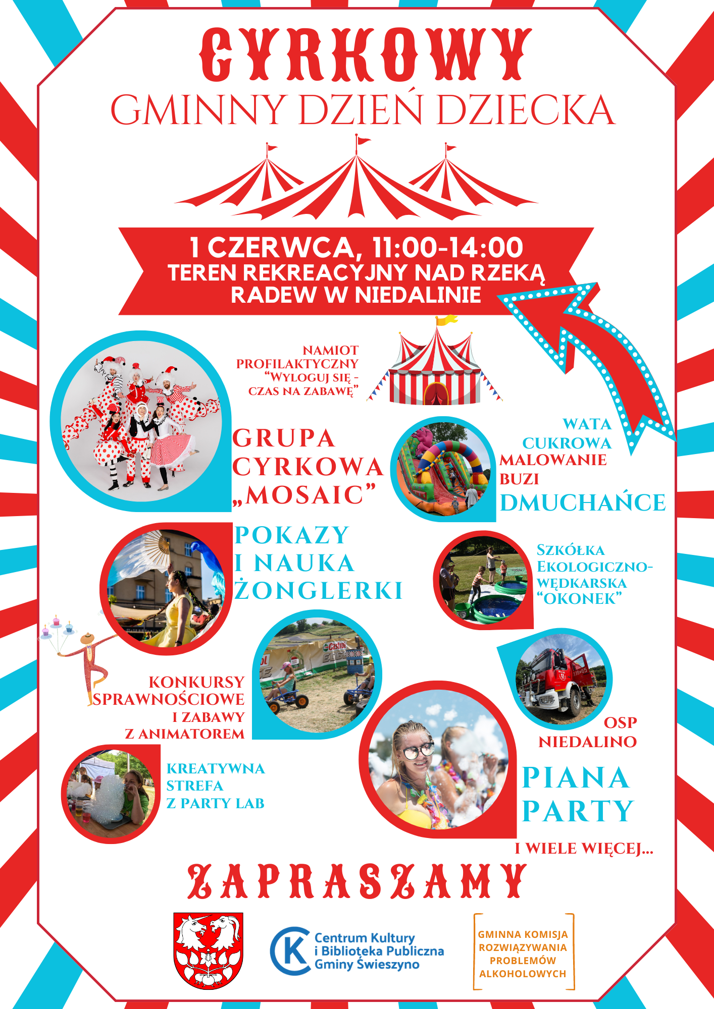 Zapraszamy na Cyrkowy Gminny Dzień Dziecka w malowniczym miejscu Gminy Świeszyno nad rzeką Radew w Niedalinie. W programie zabawy z animatorem oraz konkursy z upominkami. W namiocie profilaktycznym zorganizowany zostanie konkurs plastyczny pt. "Wyloguj się - czas na zabawę" z cudownymi nagrodami. Na uczestników czekać będą pokazy i nauka żonglerki w namiocie kuglarskim, dmuchane atrakcje i malowanie buzi, strefa kreatywna oraz wystrzałowa strefa malarstwa nowoczesnego. Koła Gospodyń Wiejskich przygotują przepyszne smakołyki, a "candy bar" zapewni watę cukrową dla każdego. Dodatkową atrakcją będzie grupa cyrkowa, która z pewnością zaciekawi swoimi umiejętnościami nie tylko najmłodszych. Szczudła, żonglerka to tylko mała namiastka ich umiejętności, a zakończeniem będzie "Piana Party" przy muzyce. 1 czerwca godzina 11:00-14:00. Zapraszamy!