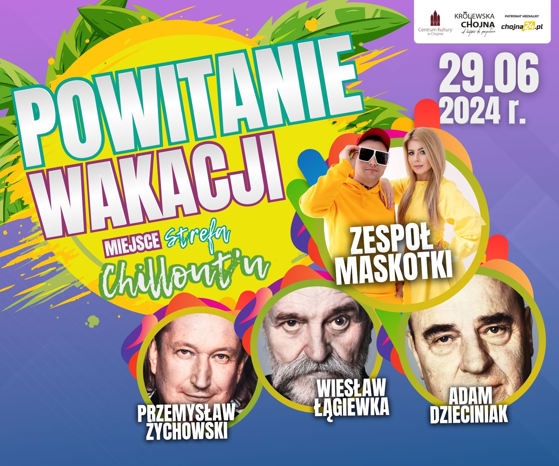 POWITANIE WAKACJI - Program 12:00 Występy artystyczne uczestników zajęć Centrum Kultury 12:30 Zespół Maskotki – koncert dla dzieci 13:30 Gry i zabawy dla dzieci 14:00 Występy artystyczne uczestników zajęć Centrum Kultury 15:00 Otwarcie wystawy fotograficznej ,,Czerwony" Fotoklub Zamek 15:30-18:30 Otwarte warsztaty fotograficzne z Fotoklub Zamek 19:00 Występy Wanessy Zagórskiej 20:00 Rewia Kabaretowa w wykonaniu aktorów Teatru Polskiego w Szczecinie: Adam Dzieciniak, Wiesław Łągiewka, Mirosław Kupiec. Dodatkowo: malowanie twarzy, zamek dmuchany, bańki mydlane i kolorowe warkoczyki, akcje ,,Ciuch w ruch", Nadodrzańskie spotkanie z historią.