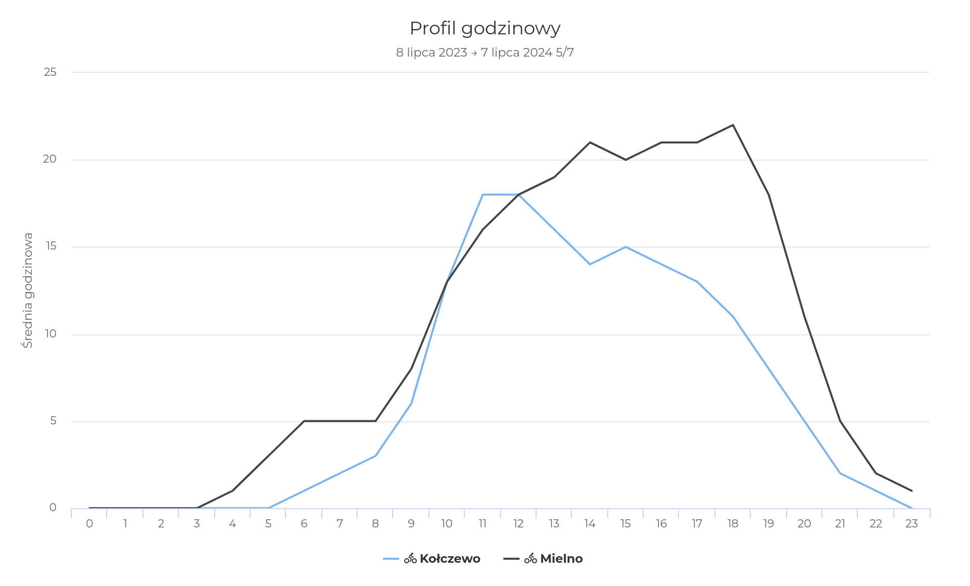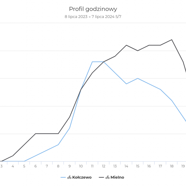 Interesujące dane możemy też wyciągnąć z godzin przejazdów, szczególnie w dni powszednie. Mielno zasłużenie bywa nazywane polskim Las Vegas - jest aktywne do późnych godzin. Wysoki ruch utrzymuje się tam nawet do godziny 21. Zupełnie inny charakter zdaje się mieć odcinek w miejscowości Kołczewo pomiędzy Wisełką a Dziwnowem. Tam szczyt przejazdów rejestrujemy w południe, następnie ich liczba spada, a po godzinie 19 licznik odnotowuje jedynie pojedyncze przejazdy.