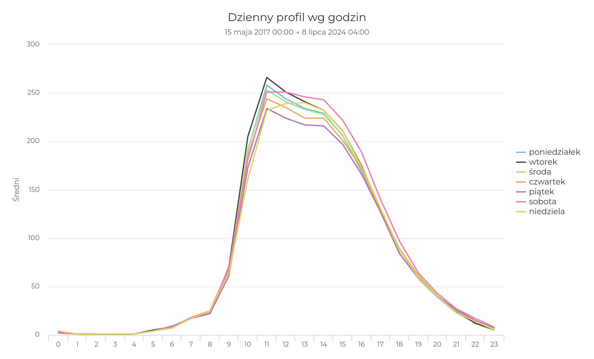 Wracając do miejscowości nadmorskich, możemy zauważyć tam ciekawe zjawisko - wiele liczników odnotowuje każdego dnia tygodnia niemal identyczny schemat przejazdów. Z reguły to sobota i niedziela wyróżnia się na tle dni powszednich, ale nie dla takich miast jak Świnoujście czy Darłowo. Pozostaje zadać sobie pytanie, czy to dlatego, że przejechanie trasy wzdłuż Bałtyku zajmuje kilka dni, czy raczej mieszkańcy wybierają rower jako codzienny środek transportu. Poniżej porównanie dla Świnoujścia.