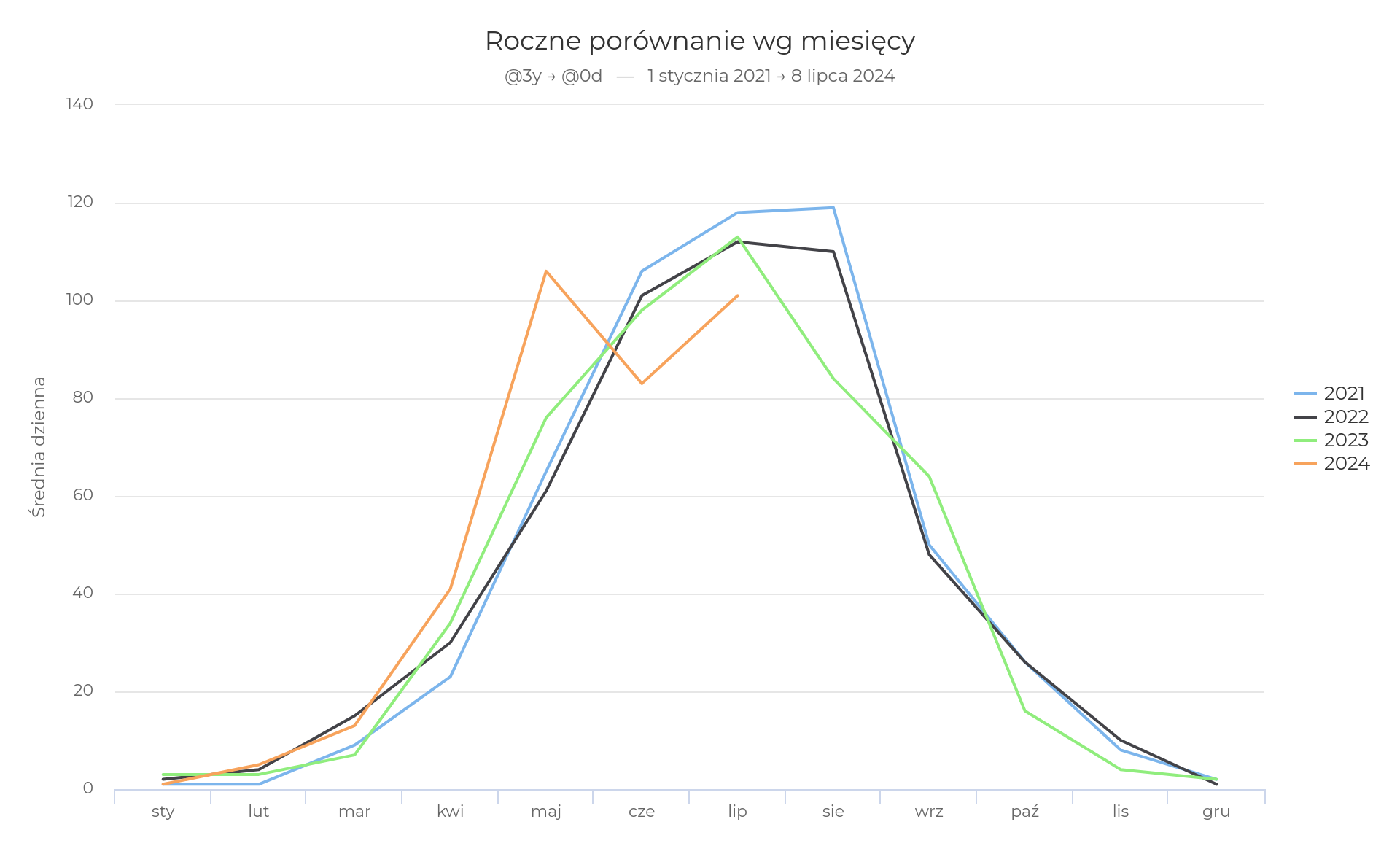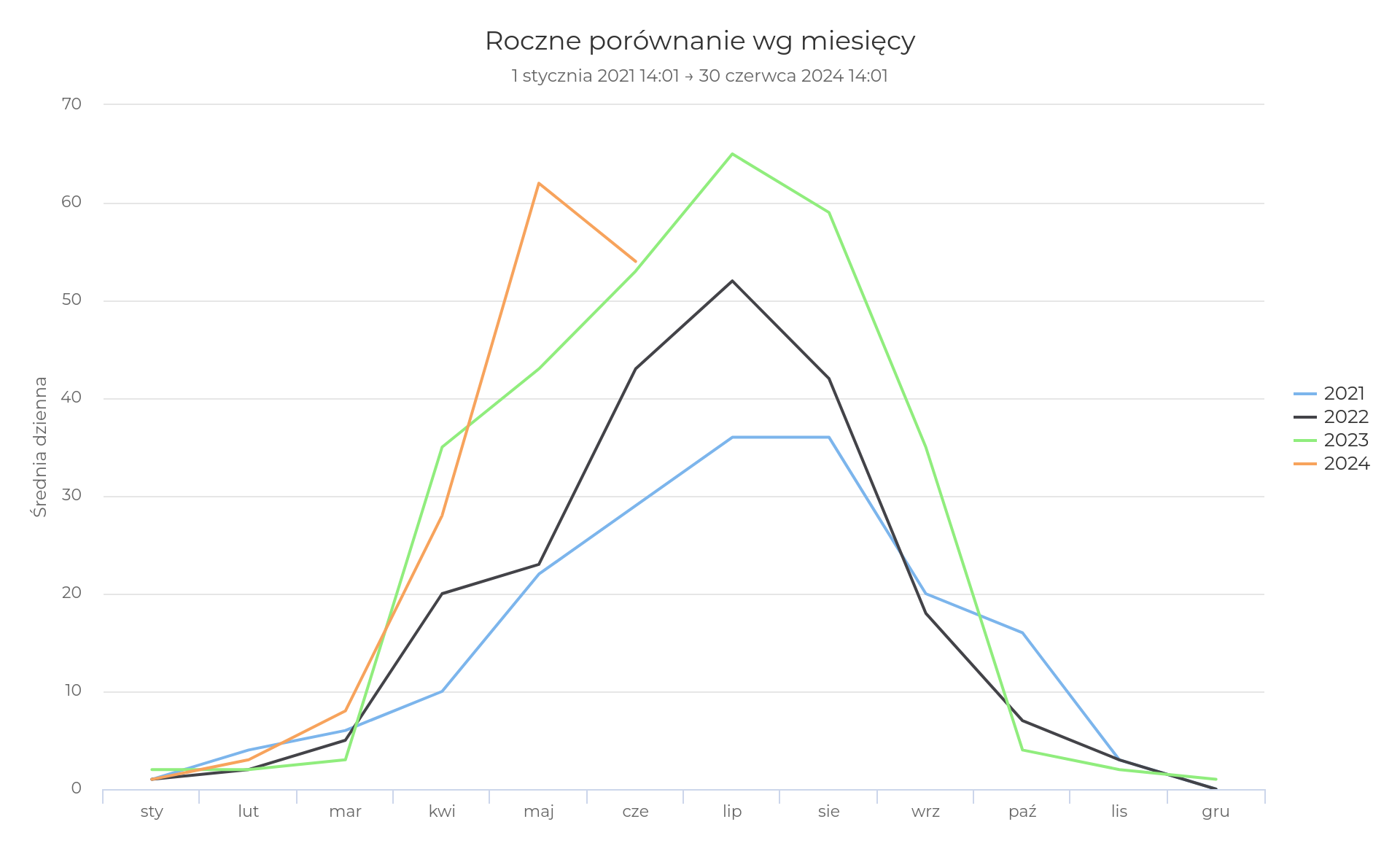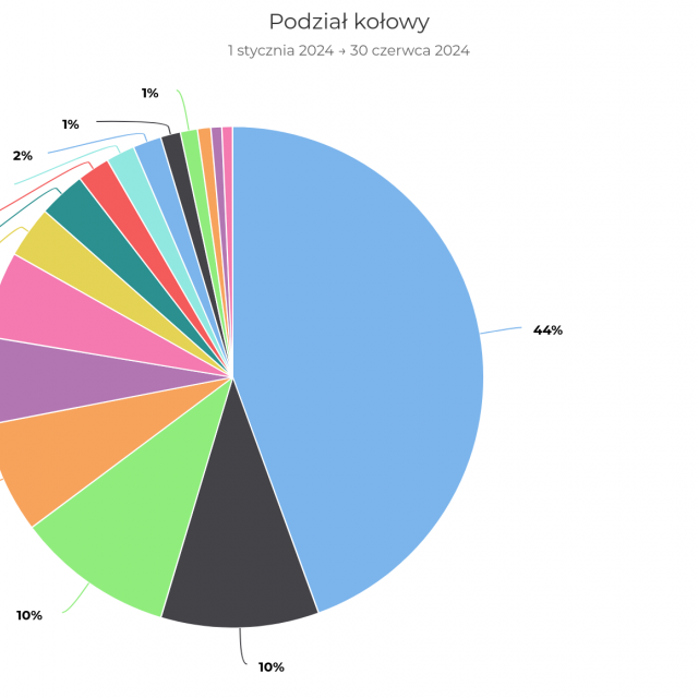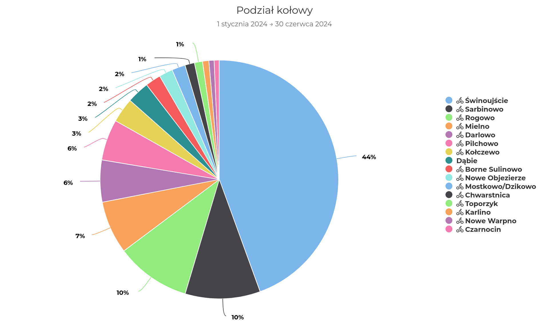 Liczniki są niezwykle przydatne, gdy chcemy sprawdzić popularność i sezonowość danych tras. Dla przykładu: wiemy, że w pierwszym półroczu 2024 roku punkt pomiarowy w Świnoujściu odnotował ponad 300 tys. przejazdów, co daje średnio 1700 przejazdów dziennie i ok. 44% wszystkich zarejestrowanych rowerzystów w województwie. Oczywiście udział ten jest realnie mniejszy, w wielu miejscach tych liczników nie ma, dlatego właśnie im więcej punktów pomiarowych zostanie zainstalowanych na trasach, tym pełniejsze będą dane. Powyżej widzimy udział przejazdów przez poszczególne liczniki w kolejności malejącej. Przez zaledwie pięć liczników przejechało ponad 75% zarejestrowanych rowerzystów. Wszystkie pięć miejscowości położone jest nad morzem.