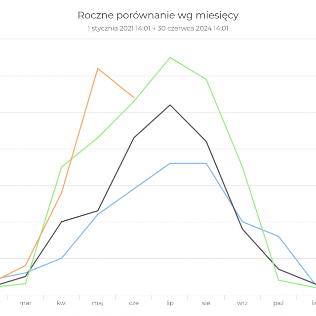 Intensywne prace prowadzone są też na Trasie Pojezierzy Zachodnich. Niedaleko Mostkowa, pomiędzy Barlinkiem a Myśliborzem, również mamy licznik. Od lat, pomiędzy majem a wrześniem, obserwujemy stabilną liczbę ok. 4 tysięcy rowerzystów miesięcznie. I mimo że nie zapowiada się na nowy rekord, to w tym półroczu odnotowaliśmy 18% wzrost względem analogicznego okresu w 2023 roku, co jest najwyższym wynikiem wśród naszych tras. A wszystko to za sprawą rosnącej liczby przejazdów w okresie wczesnowiosennym. Trasa Pojezierna, między słynnym już mostem w Siekierkach a Choszcznem, charakteryzuje się bardzo dobrą infrastrukturą, są to w większości odseparowane i gładkie drogi rowerowe, co może zachęcać do podróżowania również w mniej sprzyjających warunkach.