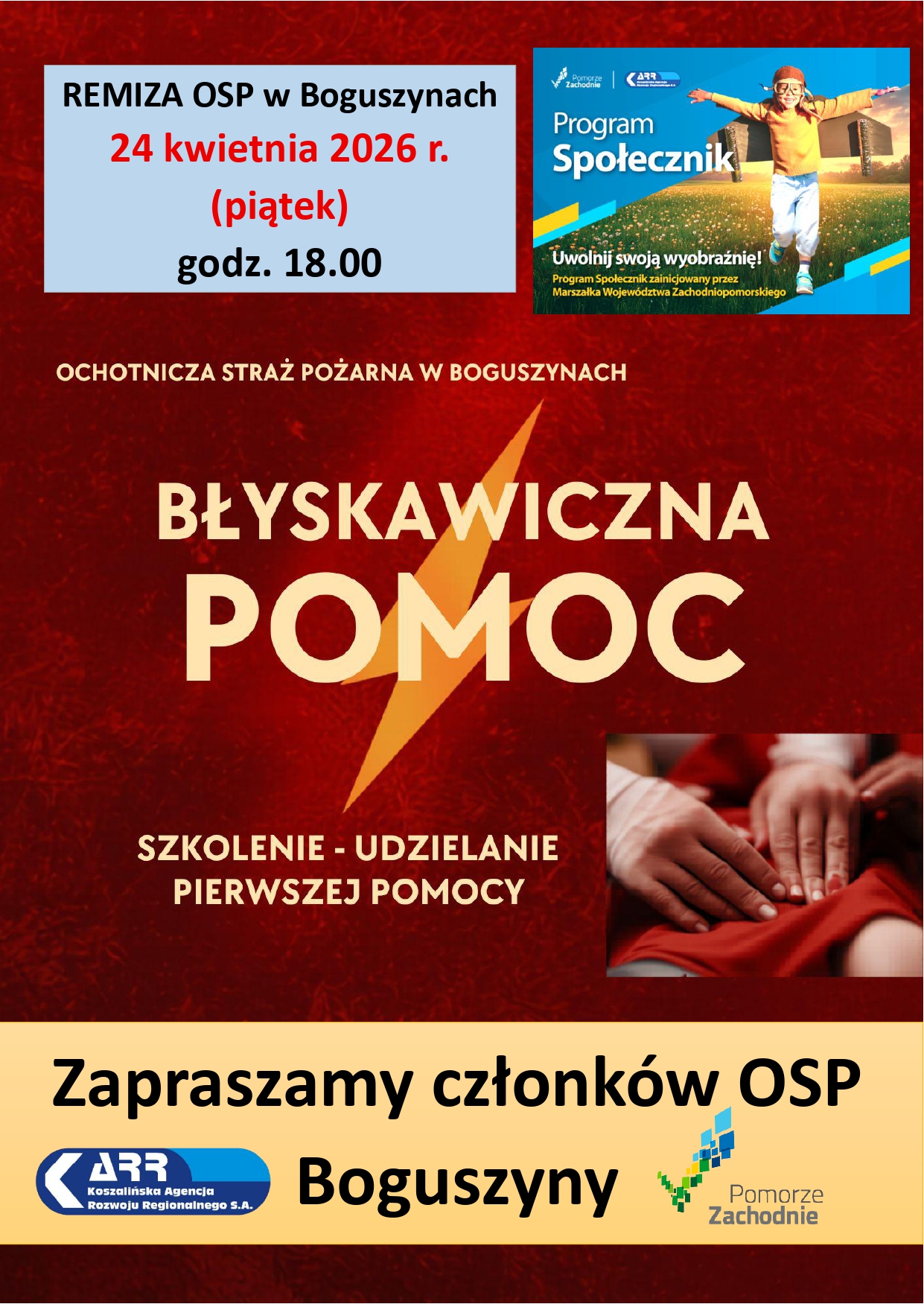 Am 24. April 2026 findet im Rahmen des Projekts „Błyskawiczna Pomoc“ („Społecznik na 5! Programm zur Förderung von Basisinitiativen für die Jahre 2025–2029“) findet in der Feuerwache der Freiwilligen Feuerwehr in Boguszyny eine moderne Erste-Hilfe-Schulung statt, die sich an Mitglieder der Freiwilligen Feuerwehr richtet. Dies ist eine hervorragende Gelegenheit, praktische Rettungsfähigkeiten zu erwerben und zu lernen, wie man in lebensbedrohlichen Situationen effektiv reagiert.