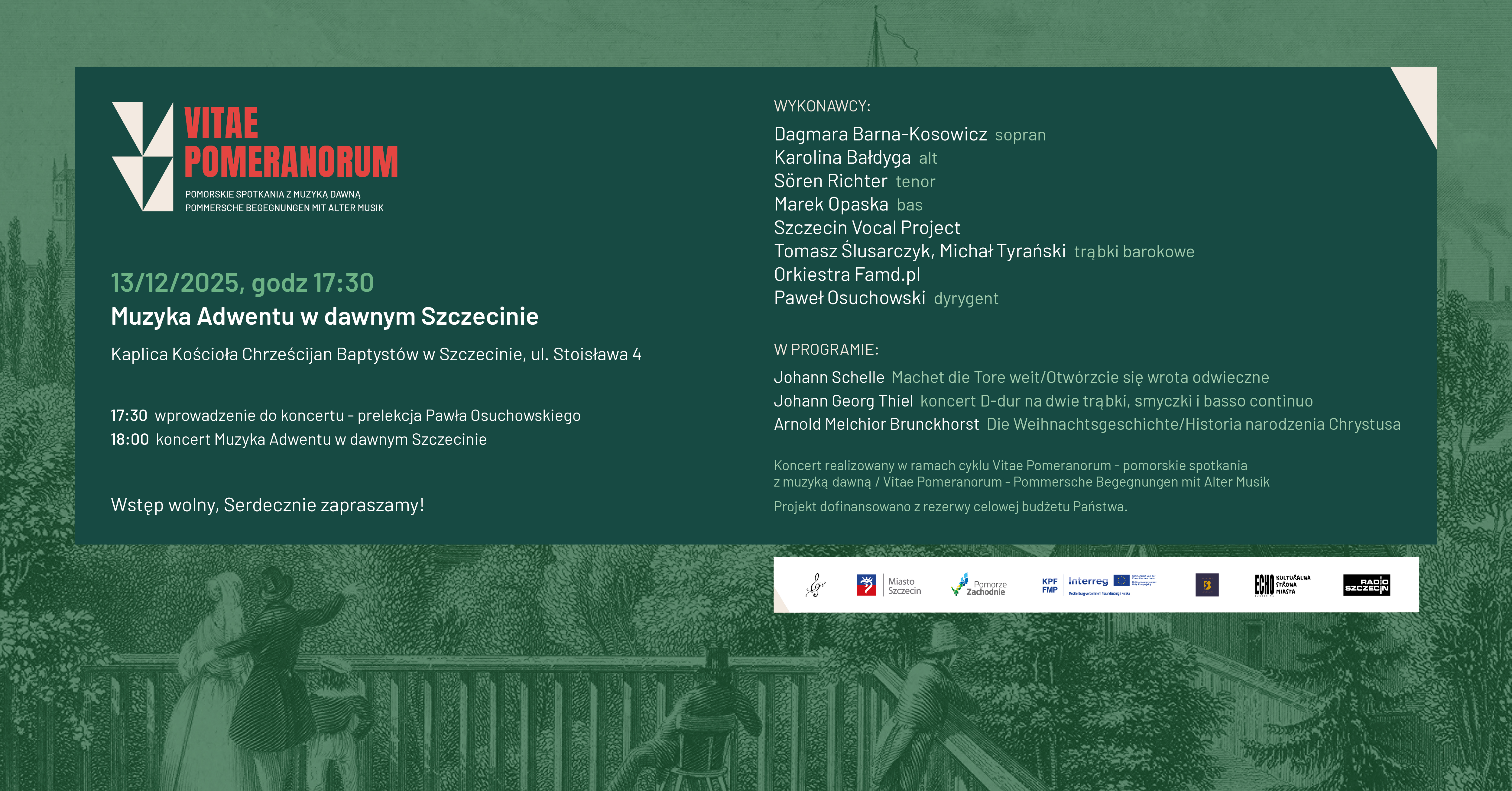 Traditionally, in December, we invite you to a meeting with Advent Music in old Szczecin, part of a series of historical concerts organized by the Early Music Academy Foundation. This will be the last opportunity this year to hear the Szczecin Vocal Project and the Famd.pl Orchestra conducted by Paweł Osuchowski. The concert program will include masterpieces of Baroque music from the North German Lutheran tradition, by composers who combined the style of the northern school with Italian traditions of sacred art. A unique opportunity will be the performance of one of the few surviving works by Arnold Melchior Brunckhorst – Die Weihnachtsgeschichte – The Story of the Nativity. The concert will take place in the Chapel of the Baptist Church in Szczecin (ul. Stoisława 4) on Saturday, December 13, 2025, at 6:00 p.m. The concert will be preceded by a lecture by Paweł Osuchowski at 5:30 p.m., introducing the composers and musical traditions of ancient Pomerania.
