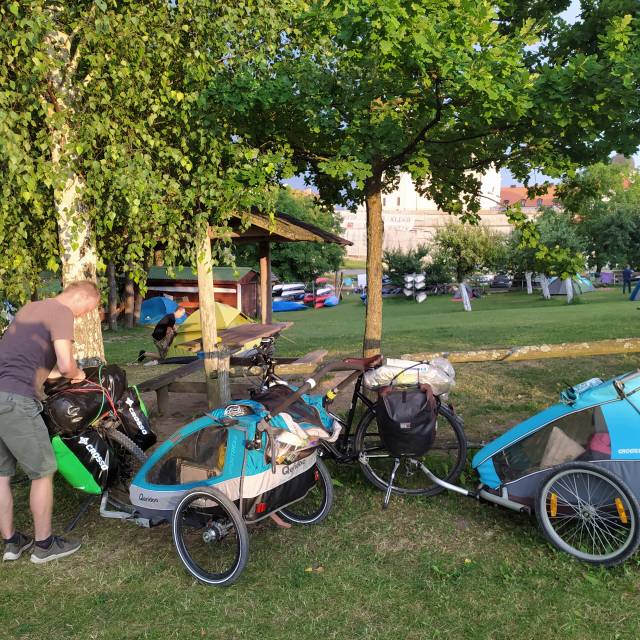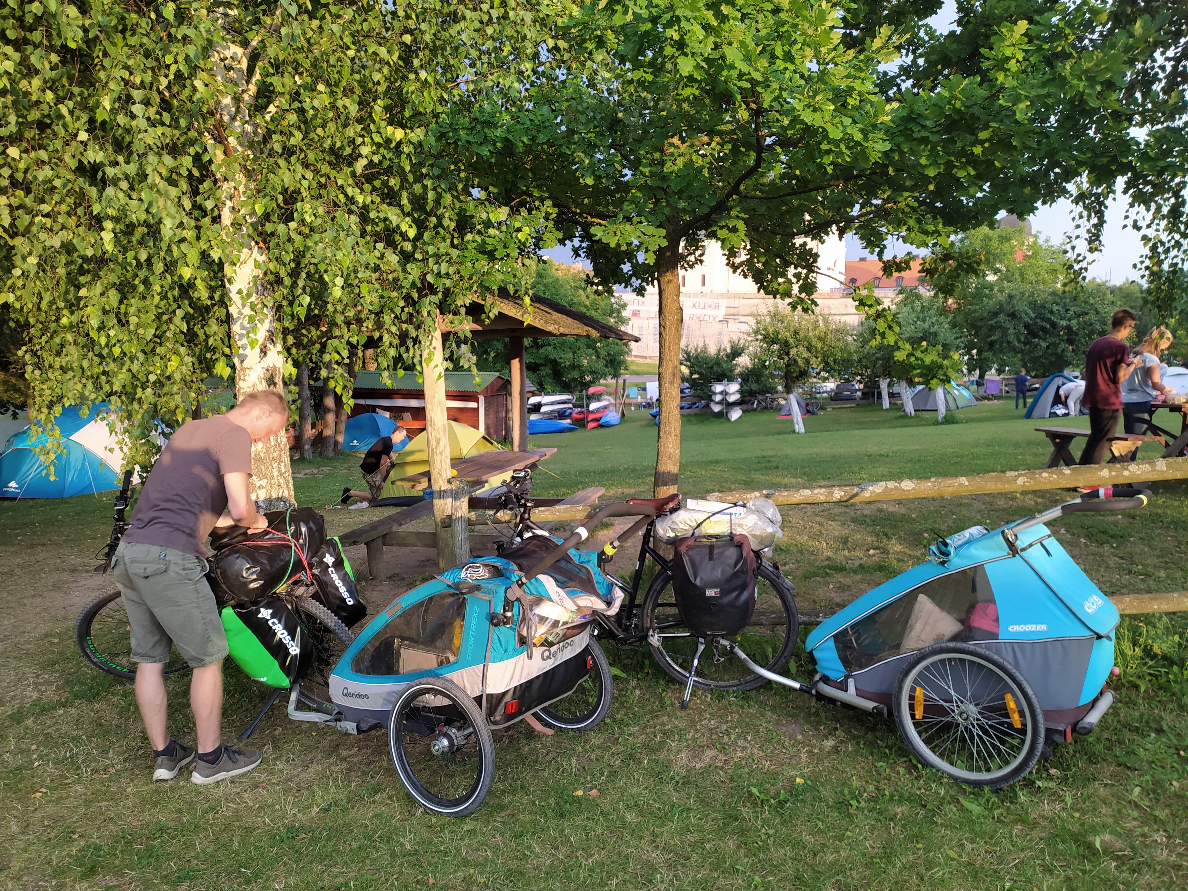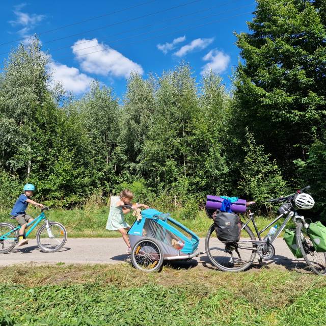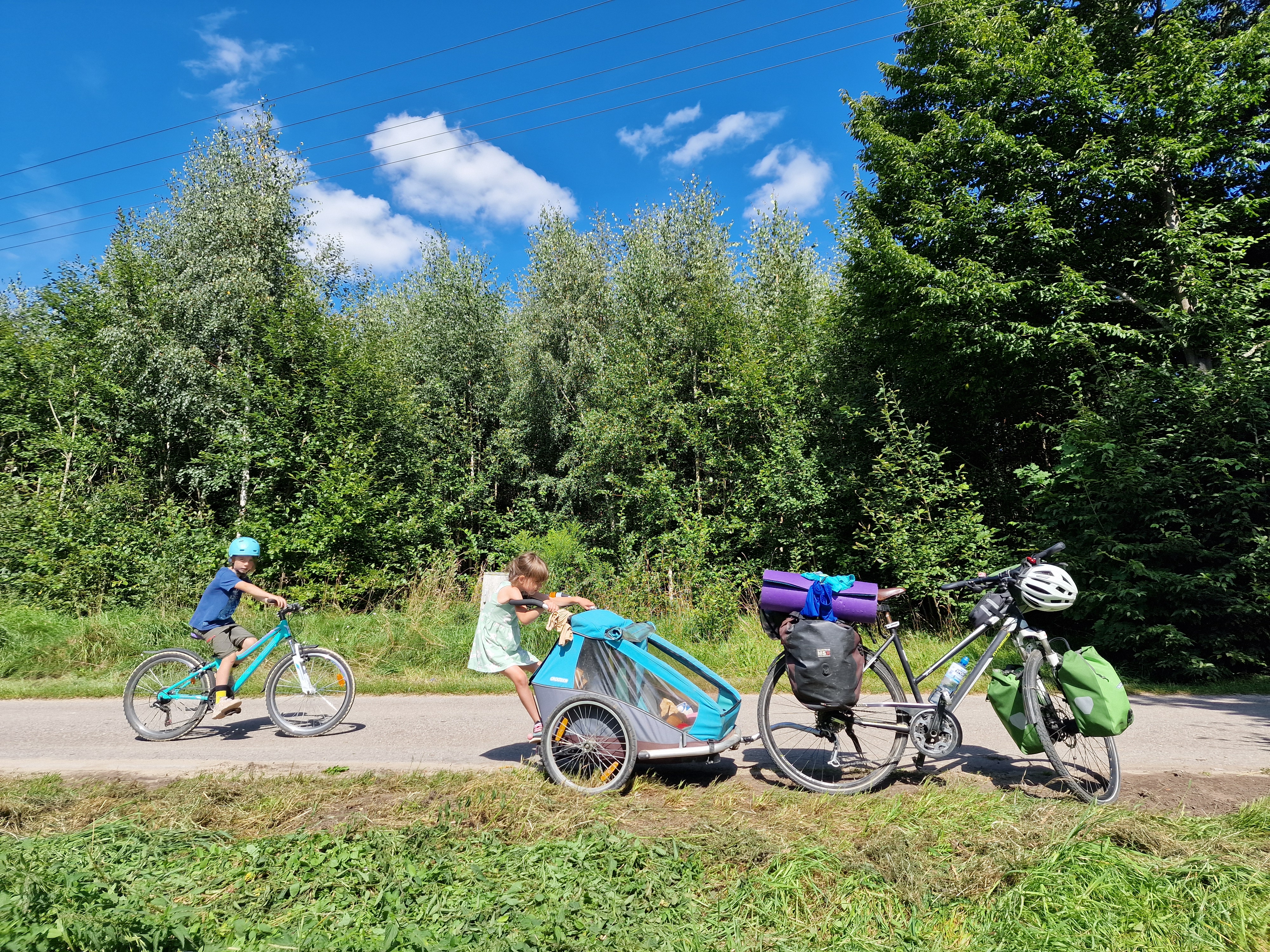 Our travels over longer distances, e.g. on the Green Velo during a 2-week trip with Marika, who was one year old at the time, and Nicolas, who was 4 years old at the time, were as follows: one day we travelled between 50 and 70 kilometres, stopping for about 1 -1.5 hours for lunch and a playground. The following day was spent stationary, e.g. at a campsite, lake or similar place where we could spend time together in a stationary but active way, e.g. swimming in water. It is important not to tire the children by sitting in the caravan.