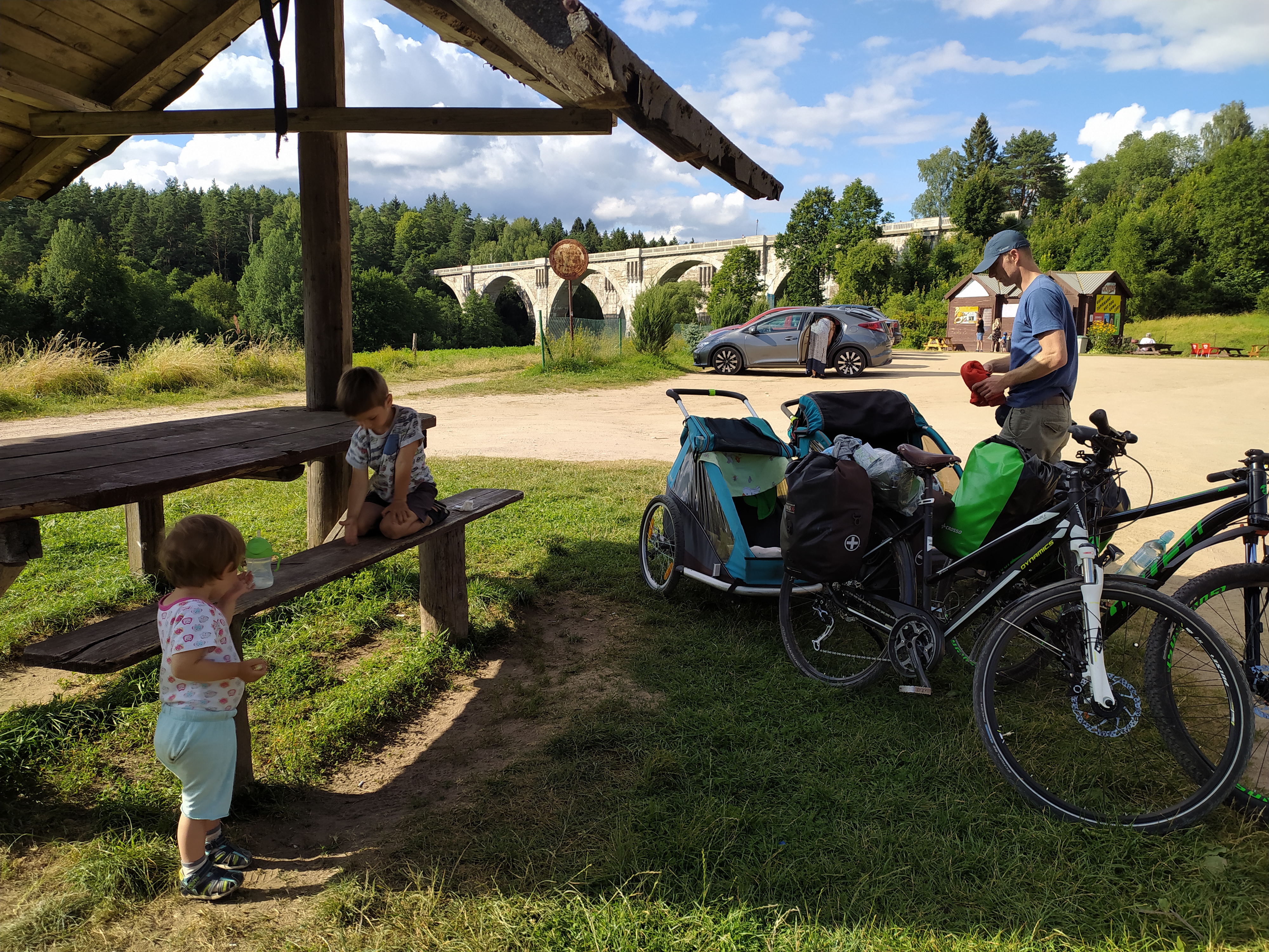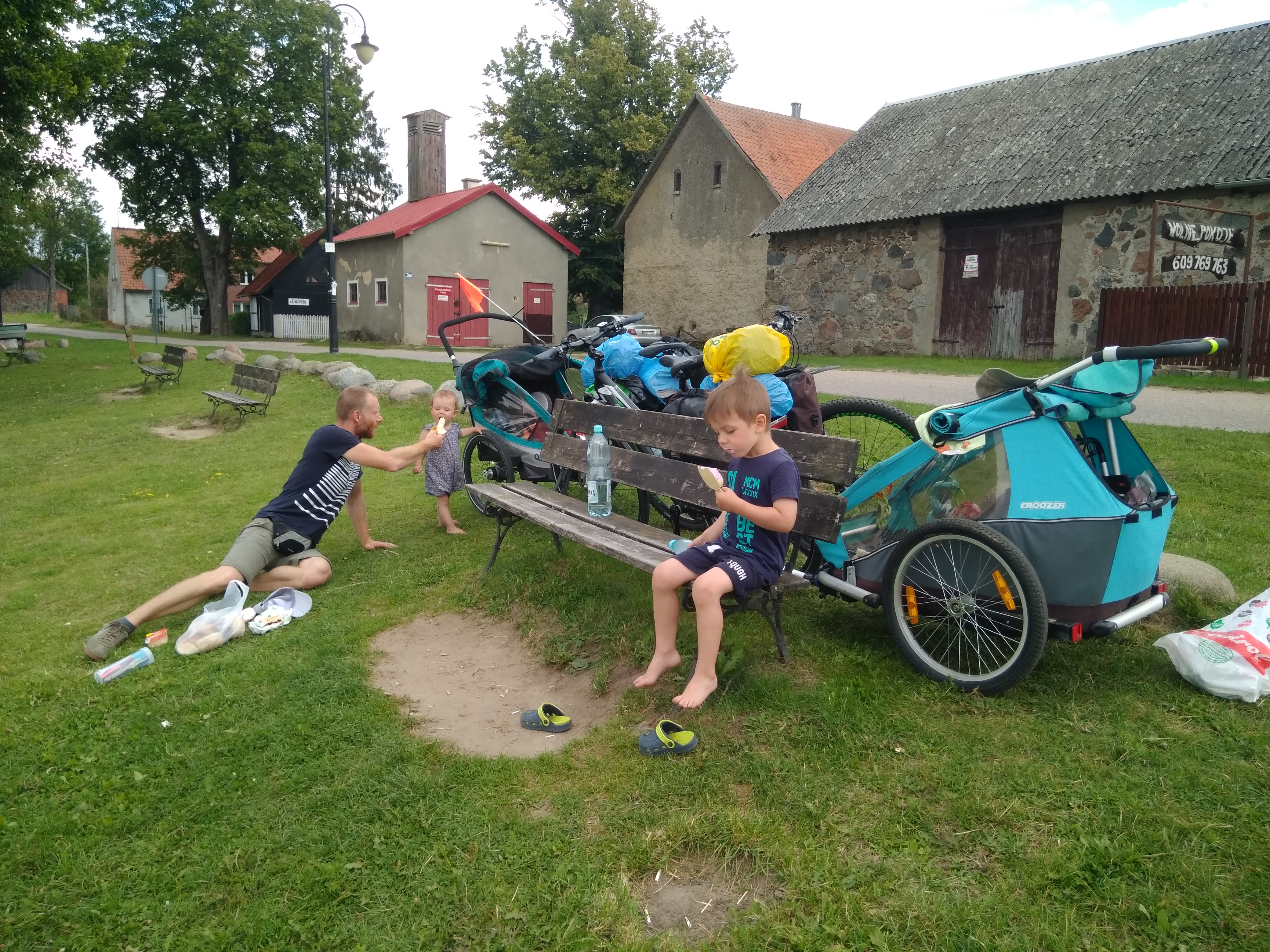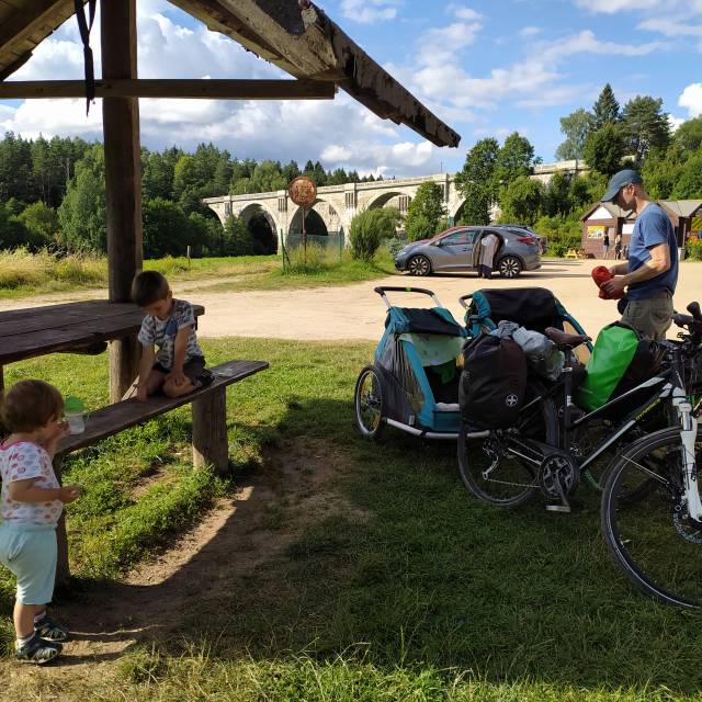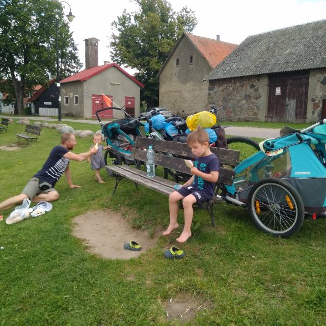 Our travels over longer distances, e.g. on the Green Velo during a 2-week trip with Marika, who was one year old at the time, and Nicolas, who was 4 years old at the time, were as follows: one day we travelled between 50 and 70 kilometres, stopping for about 1 -1.5 hours for lunch and a playground. The following day was spent stationary, e.g. at a campsite, lake or similar place where we could spend time together in a stationary but active way, e.g. swimming in water. It is important not to tire the children by sitting in the caravan.