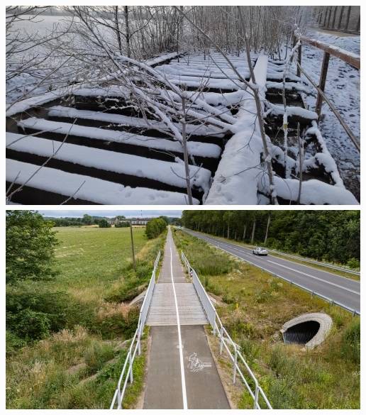 This category also includes the footbridge at Lake Kopań on the Velo Baltica route, which is approximately 30 meters long. It is a small but important part of the route, allowing cyclists to bypass the existing section, which is often covered with sand.
