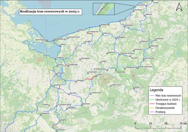 The West Pomeranian Province continues to intensively develop its network of bicycle routes. An analysis of completed, ongoing, and planned sections shows that the region is implementing investments of varying scale, from short connectors improving the cohesion of the network to long, multi-kilometer sections of new routes. Cyclists already have access to nearly 1,000 km of a coherent network of bicycle routes. In 2025, 104 km of routes were marked, of which 51 km are bicycle paths separated from motor traffic. Nearly 50 km are under construction, and tenders have already been announced for the marking of another 40 km. (A high-resolution map can be found at the bottom of the page).